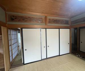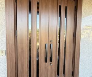 こんにちは。角谷由美です。今日は、大きな欄間付きの両開きの木製玄関ドアをカバー工法の玄関ドアに交換し